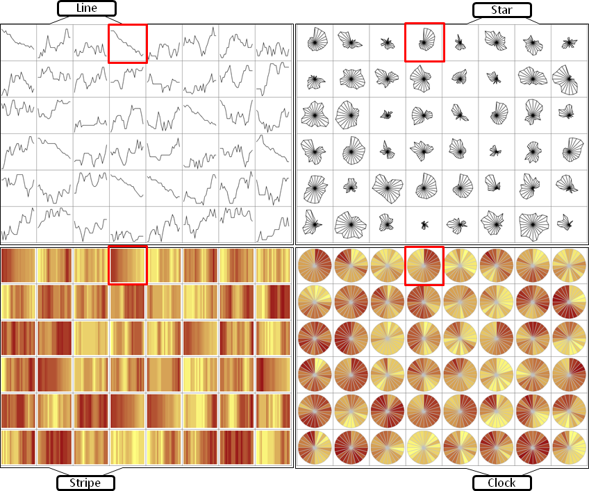 Yet, due to glyphs’ power in presenting multiple time series for comparison, a multitude of designs have been proposed. Different visual variables such as length, color, or position can be used to encode two aspects of temporal data in one glyph: a) the location of a data point in time, and b) the quantitative data value. When confronted with the task of choosing an appropriate glyph design, a visualization designer or practitioner currently has little guidance on which encodings would be most appropriate for which tasks and on which visual features and factors influence people’s perception of data encoded in glyphs. In order to address this lack of guidance on the use of temporal glyphs, we ran a controlled experiment to compare four carefully selected glyphs using two different data densities. Read more for example in this publication.